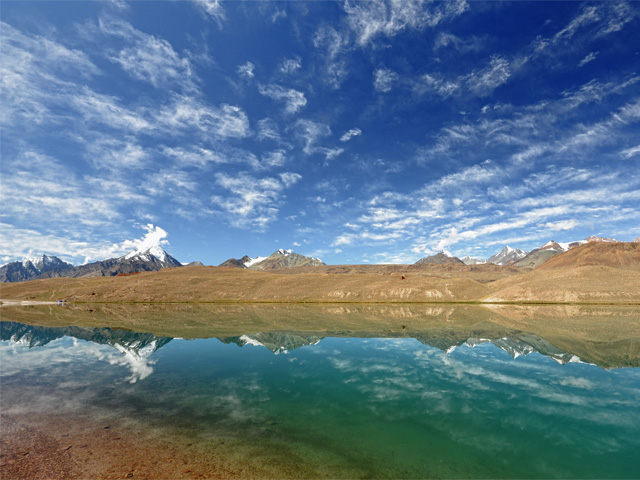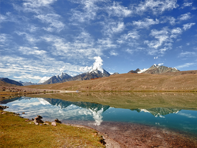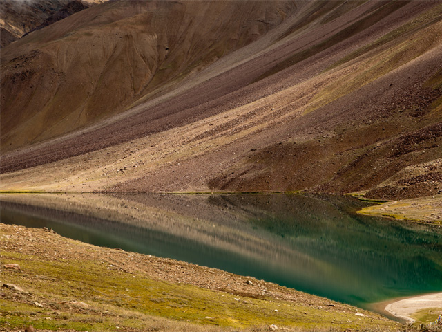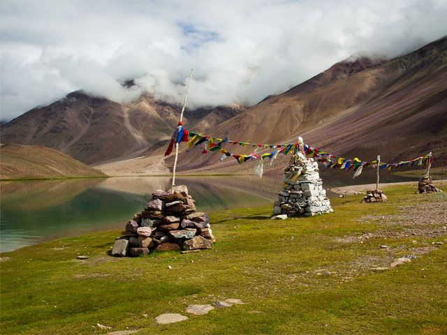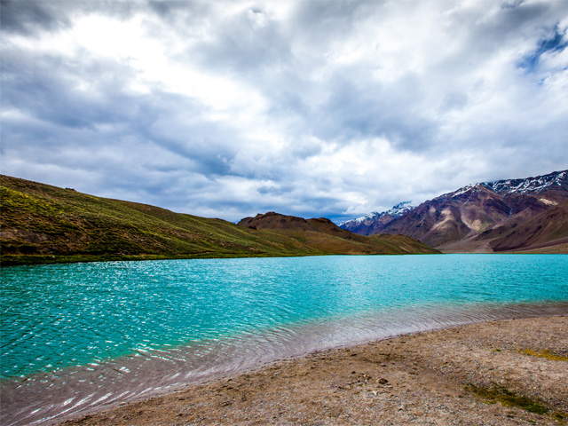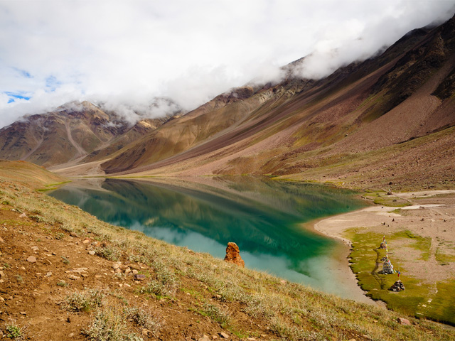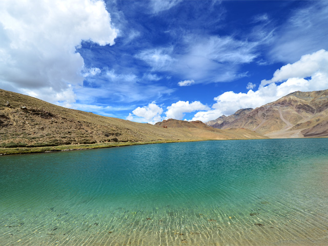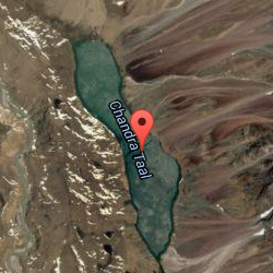Chandra Taal (meaning the Lake of the Moon), or Chandra Tal, is situated at an altitude of about 4,300 metres (14,100 ft) in the Himalayas.[1] Mountains of scree overlook the lake on one side, and a magnificent cirque presents a view on the other. The name of the lake originates from its crescent shape. Situated in the Spiti part of the Lahul and Spiti district of Himachal Pradesh (India), Chandra Taal is a popular destination for trekkers and campers. The lake is accessible on foot from Batal as well as from Kunzum Pass from late May to early October. There is also a motorable road from Batal which is 14 km (8.7 mi) away from Chandra Taal, but before August, its condition can be bad. The most surprising thing about this lake is that there is no visible source of this lake but there is a visible outlet of this lake which means that water to this lake comes from underground.