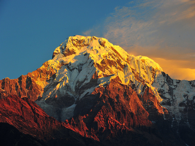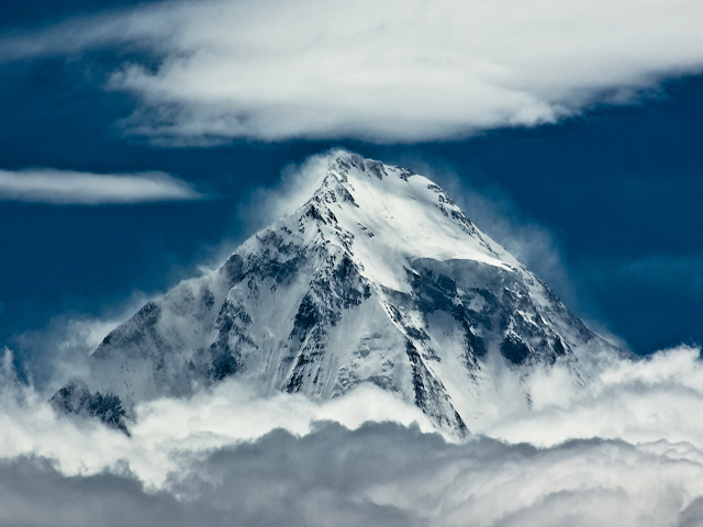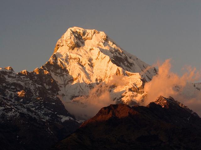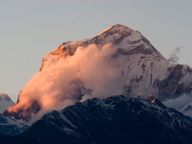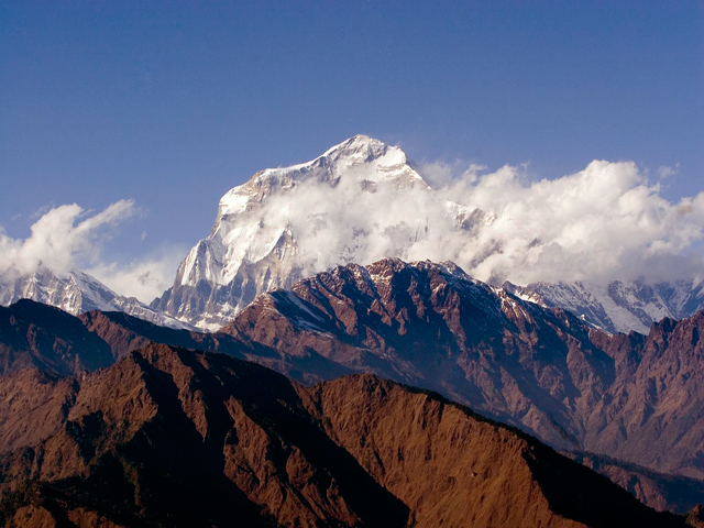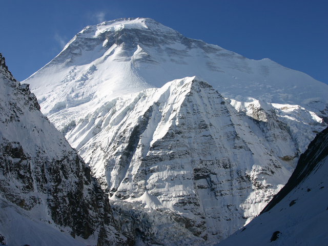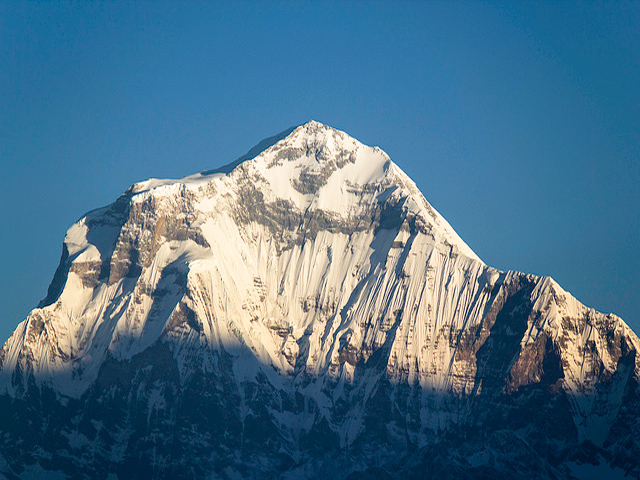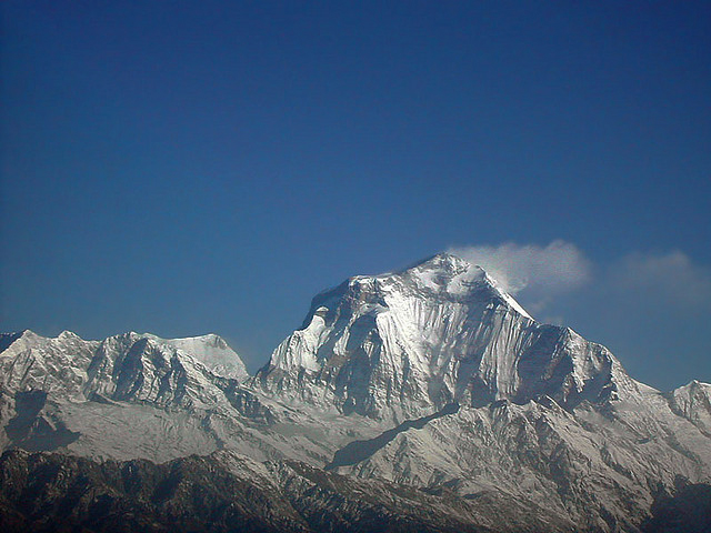 The Dhaulagiri massif in Nepal extends 120 km (70 mi) from the Kaligandaki River west to the Bheri. This massif is enclosed on the north and southwest by tributaries of the Bheri and on the southeast by Myagdi Khola. Dhaulagiri I at 8,167 metres (26,795 ft) ranks seventh among Earth's fourteen peaks over eight thousand metres. It was first climbed on May 13, 1960 by a Swiss/Austrian/Nepali expedition. The mountain's name is dhaulagiri in Nepali. This comes from Sanskrit where dhawala means dazzling, white, beautiful and giri means mountain. Dhaulagiri I is also the highest point of the Gandaki river basin.Dhaulagiri I's sudden rise from lower terrain is almost unequaled. It rises 7,000 m (22,970 ft) from the Kali Gandaki River 30 km to the southeast.