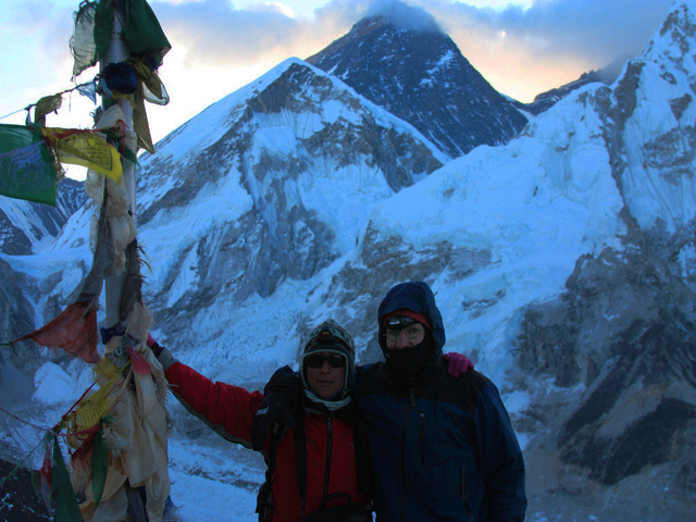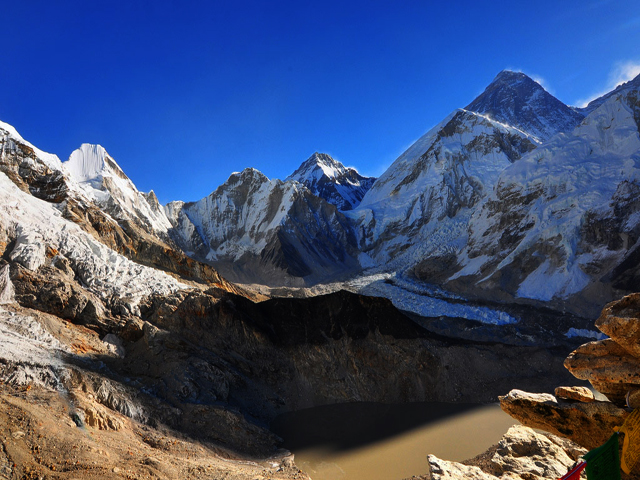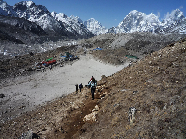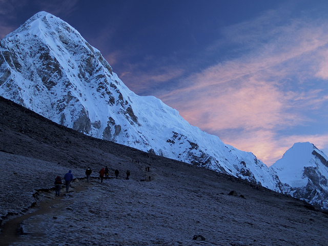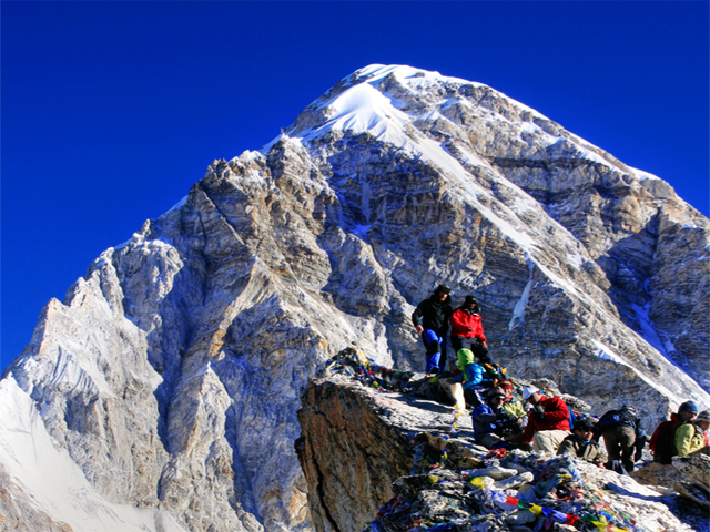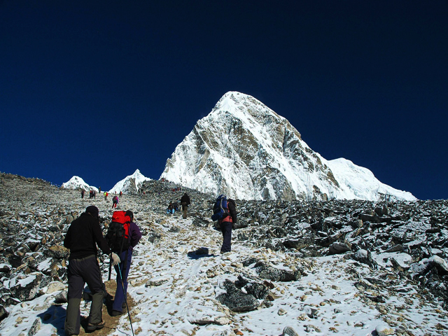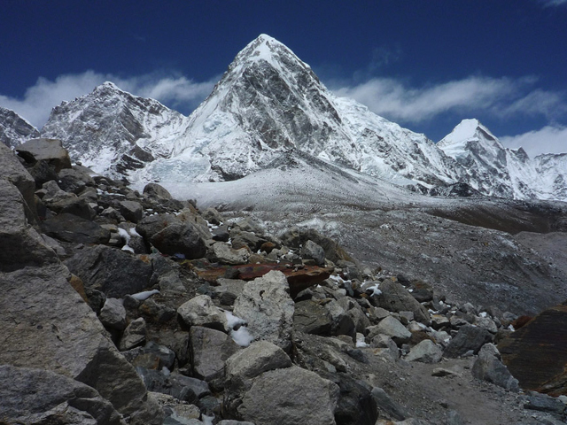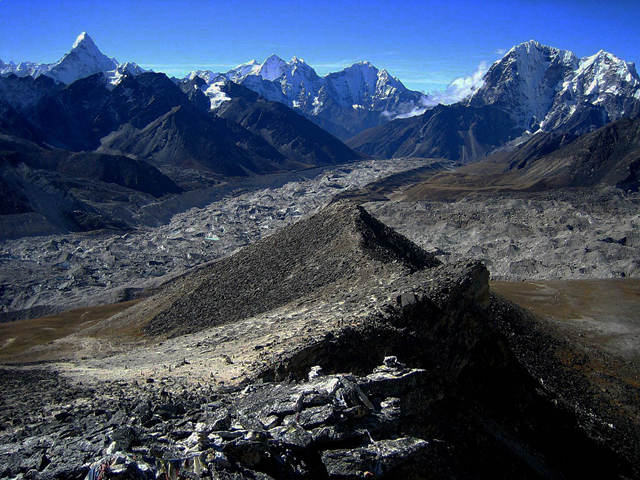 Kala Patthar, meaning black rock in Nepali and Hindi, is a notable landmark located on the south ridge Pumori (7,161 m or 23,494 ft) in the Nepalese Himalayas. Although not a proper mountain with a prominence of only (10 m or 33 ft), the ascent of Kala Patthar is very popular with trekkers in the region of Mount Everest, since it provides the most accessible point to view Mt. Everest from base camp to peak (due to the structure of Everest, the peak cannot be seen from the base camp). "The views of Everest, Nuptse Nup II and Changtse are spectacular from Kala Patthar and there are glimpses of the northern flank and summit of Lhotse. The world's highest webcam, Mount Everest webcam, is located here.