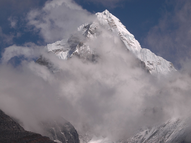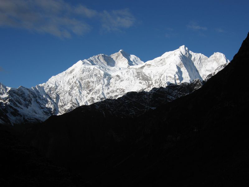 Makalu is the fifth highest mountain in the world at 8,463 metres (27,766 ft). It is located in the Mahalangur Himalayas 19 km (12 mi) southeast of Mount Everest, on the border between Nepal and China. One of the eight-thousanders, Makalu is an isolated peak whose shape is a four-sided pyramid. Makalu has two notable subsidiary peaks. Kangchungtse, or Makalu II (7,678 m) lies about 3 km (2 mi) north-northwest of the main summit. Rising about 5 km (3.1 mi) north-northeast of the main summit across a broad plateau, and connected to Kangchungtse by a narrow, 7,200 m saddle, is Chomo Lonzo (7,804 m).