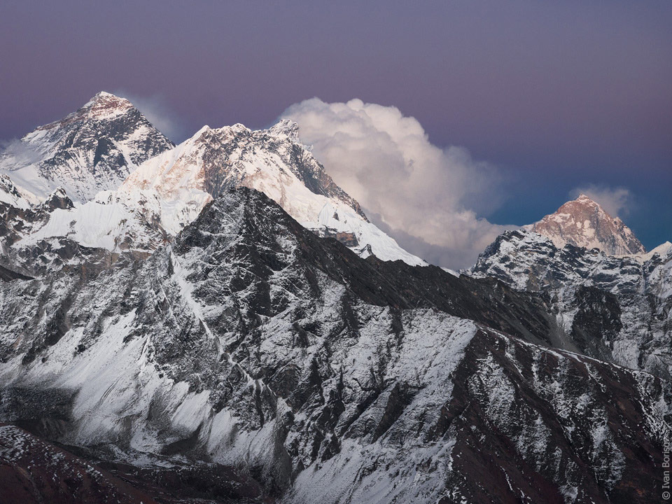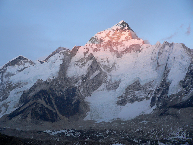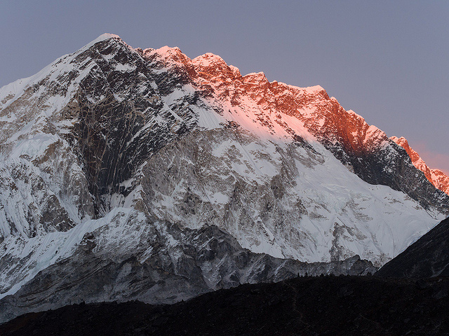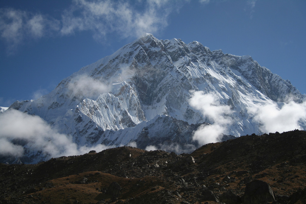 Nuptse is a mountain in the Khumbu region of the Mahalangur Himal, in the Nepalese Himalayas. It lies two kilometres WSW of Mount Everest. Nuptse is Tibetan for "west peak", as it is the western segment of the Lhotse-Nuptse massif. While Nuptse is a dramatic peak when viewed from the south or west, and it towers above the base camp for the standard south col route on Everest, it is not a particularly independent peak: its topographic prominence is only 319 m (1,047 ft). Hence it is not ranked on the list of highest mountains.